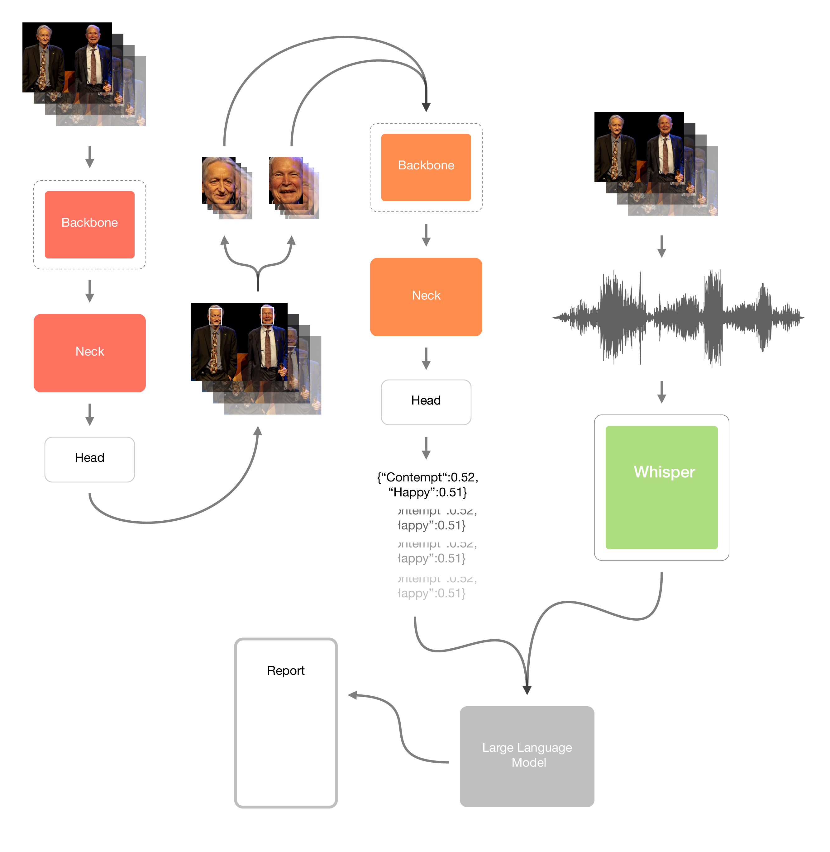 - LLM report generation: combines the transcript + logged emotions and generates a formatted interview report.
